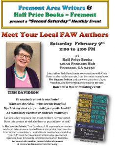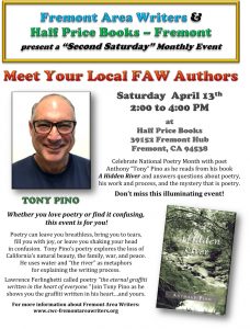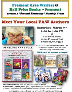 Fremont Area Writers is now partnering with Half Price Books in Fremont to present “Meet Your Local FAW Authors” monthly readings by FAW published authors on the second Saturday of each month. Readings will be scheduled from 2:00 to 4:00 pm. A different author will be featured each month. Authors will have the opportunity to read and answer questions about their work, as well as sign and sell their books.