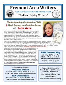 Kelley Way told us about our rights, and how to use copyrights to our best advantage at the Fremont Area Writers gathering, 2PM, Saturday, February 23rd at 42 Silicon Valley, at 6600 Dumbarton Circle, Fremont CA 94555. For more information contact Kelley Way.