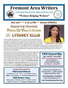 Fremont Area Writers monthly meeting, 2-4 PM. The event is admission-free, and on Zoom until further notice.