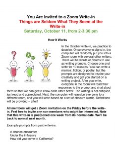 Social Write-Ins are held every second Saturday from 2 pm – 3:30 pm, and are free on Zoom. The next will be Saturday, November 8. Feel free to invite your friends. The flyer from the last write-in is below.